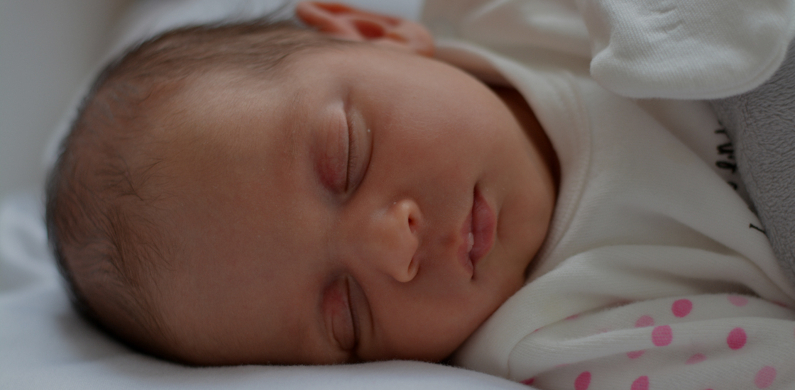 Sovende Børn – Baby der sover med hvid og prikket dragt_darken
