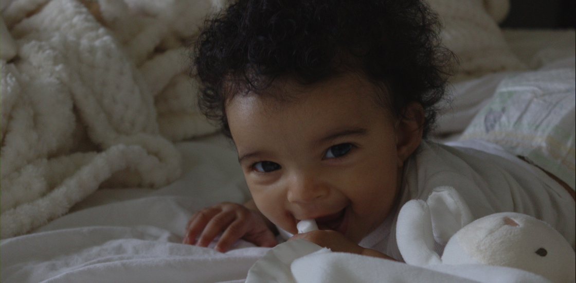 Sovende Børn – Tumling ligger på maven i sengen og griner med sutten halvvejs ude_darken